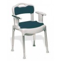 Cómoda silla con asiento acolchado, inodoro incorporado y de altura graduable. Posee un aspecto atractivo que disimula perfectamente su función. La cubeta de plástico, con tapa y asa, se puede sacar para evacuarla y facilitar su limpieza.