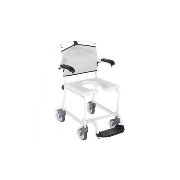 Silla de ducha fabricada en aluminio, resistente y totalmente inoxidable. Muy ligera y fácil de maniobrar. Pensada para facilitar las tareas de higiene personal: se puede colocar directamente encima del inodoro o bien utilizar la cubeta (opcional). El asiento higiénico es en forma de U para facilitar el acceso y los brazos son acolchados y abatibles para facilitar la transferencia lateral.