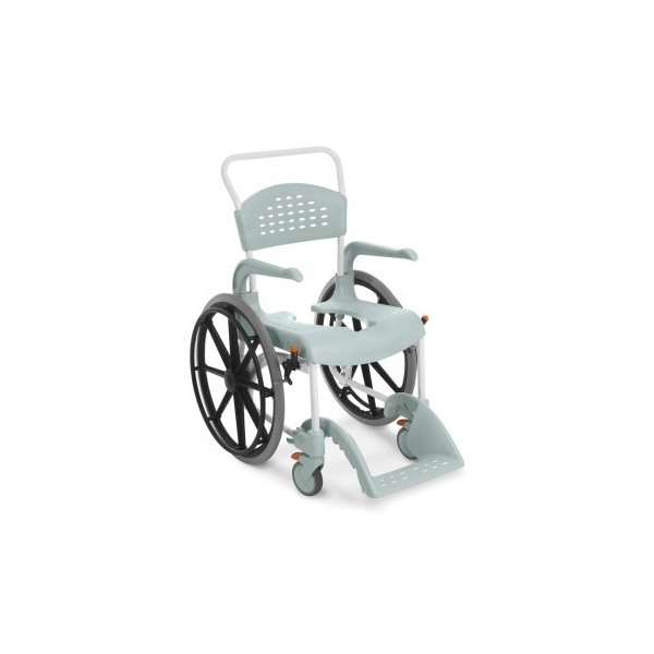 La silla de ducha Clean está fabricada en Suecia por la firma ETAC y es una silla bien equilibrada y fácil de maniobrar. Las ruedas de 600 mm permiten que el usuario impulse la silla obteniendo libertad de movimientos y mayor independencia durante la higiene.
