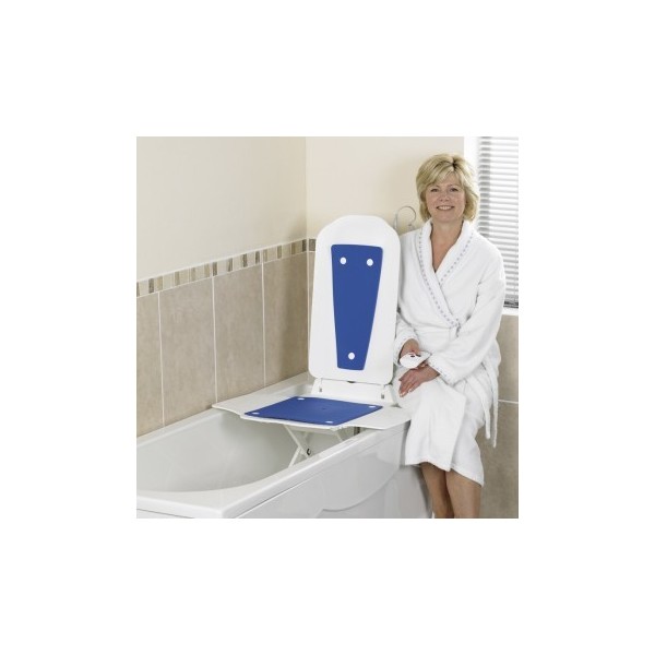 El elevador está a la altura del borde de la bañera y el usuario se sienta de manera cómoda y segura. El asiento ergonómico y agradable al tacto ofrecen gran confort. Simplemente apretando un botón, al Bath Master, desciende suavemente hasta el fondo de la bañera. Cuando el asiento está en el fondo de la bañera se puede reclinar hacia atrás el respaldo para mayor confot.