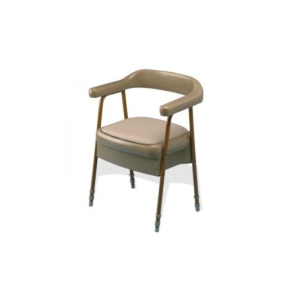 Cómoda silla con asiento acolchado, inodoro incorporado y de altura graduable. Posee un aspecto atractivo que disimula perfectamente su función. La cubeta de plástico, con tapa y asa, se puede sacar para evacuarla y facilitar su limpieza.