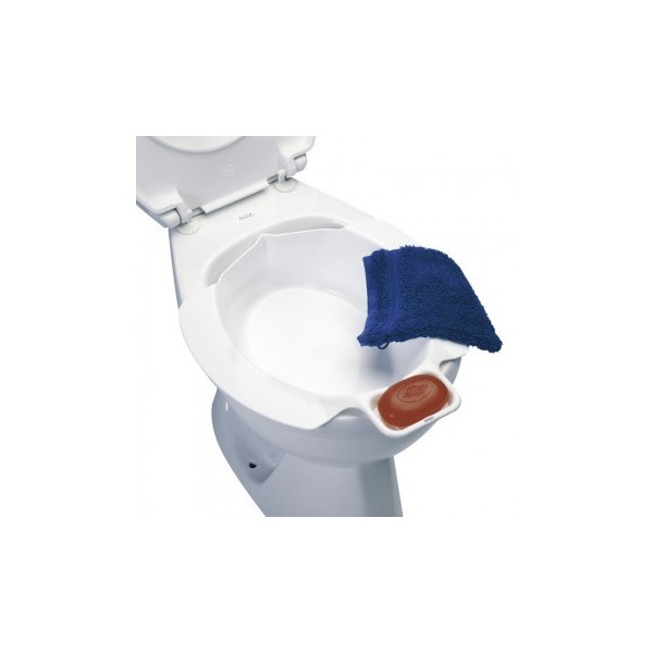 Práctico bidet de plástico, con comportamiento para el jabón, que se acopla directamente sobre la porcelana del WC para facilitar la higiene íntima.