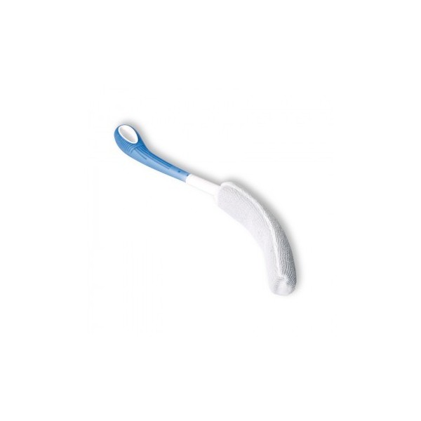 Disponible en dos versiones, corta para el cuerpo y larga y curvada para la espalda, que con su forma ergonómica hace posible alcanzar toda la espalda. La toallita se desmonta del mango y está hecha de un material especial que la hace efectiva para lavarse sin absorber demasiada agua, eso significa que la toallita continúa siendo ligera incluso mojada.