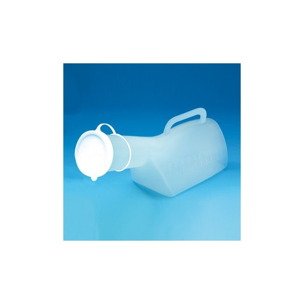 Orinal masculino, tipo botella con mango. Calibrado exterior para registrar la capacidad del contenido. Es resistente, fácil de lavar y puede ir al autoclave para su desinfección.