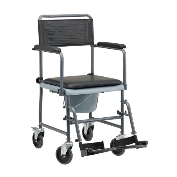 Silla inodoro con ruedas. Fabricada en acero pintado, muy duradera y resistente al uso intensivo. Ampliamente utilizada en instituciones y residencias. Silla versátil que se puede colocar directamente sobre el inodoro del WC o utilizar la cubeta / orinal con tapa que lleva incorporada para utilizarla en otro lugar.