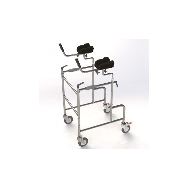 Caminador con soporte para los antebrazos de poliuretano blando. Diseñado para los procesos de rehabilitación y para responder a las necesidades de pacientes con reumatismos o artritis. Plegable. Altura graduable de 97 cm a 142 cm.