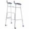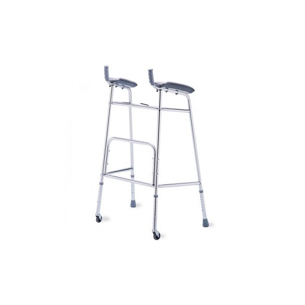 Caminador fabricado en aluminio y regulable en altura. Ruedas delanteras de 5 cm. Almohadillas para los antebrazos. Puños ajustables en largo e inclinación.