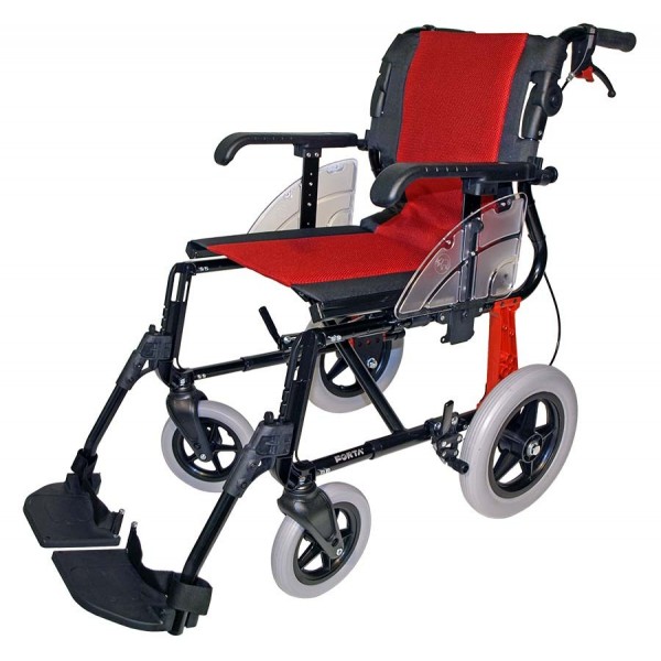 Silla de rueda pequeña con diseño moderno en color rojo y negro que incluye frenos de acompañante, respaldo partido y ejes extraíbles.