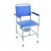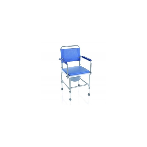 Silla de acero con inodoro. Peso máximo 120 kg, respaldo de PVC, apoyabrazos plegables, con asiento acolchado en piel sintética, desmontable. Inodoro completo con tapa de plástico, sin tornillos, permite montar y desmontar de manera fácil, sencilla y con el mínimo esfuerzo.