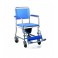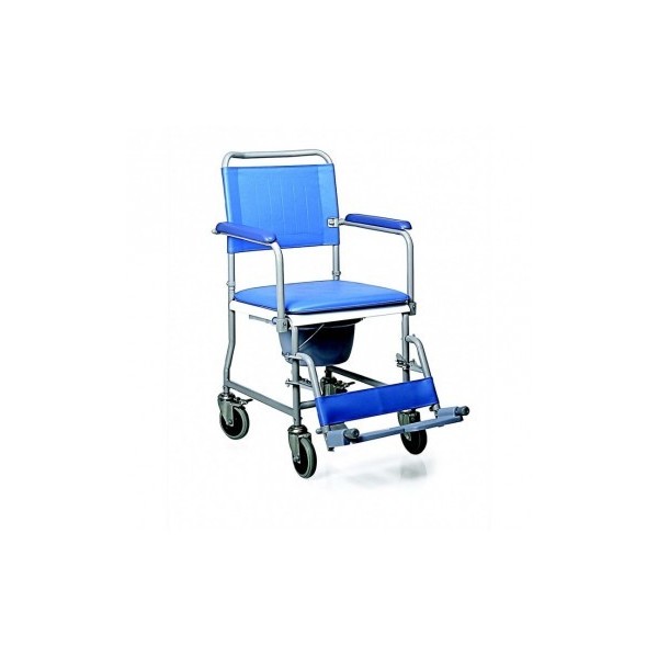 Silla de acero con inodoro y ruedas, peso máximo 120 kg. Respaldo de PVC, apoyabrazos plegables, con asiento acolchado en piel sintética desmontable, inodoro completo con tapa de plástico, reposapiés ajustable, plegable y extraíble, con 4 ruedas, 2 de ellas con freno, sin tornillos. Permite montar y desmontar de manera fácil, sencilla y con el mínimo esfuerzo.