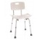 Silla de ducha con respaldo, aluminio anodizado y polietileno blanco. Altura del asiento regulable 44.5-62 cm. Medida del asiento 50 x 31 cm. Medida del respaldo 41 x 17.5 cm. Peso máximo 110 kg.