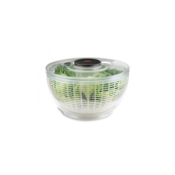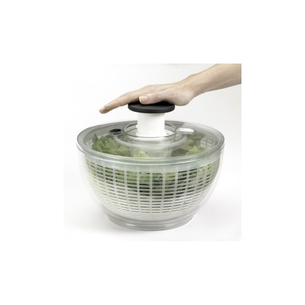 Centrifugadora de fácil manejo con una sola mano y con un sistema giratorio y botón de freno patentados. El botón pulsador se cierra para almacenar el escurridor. Base antideslizante y estable.